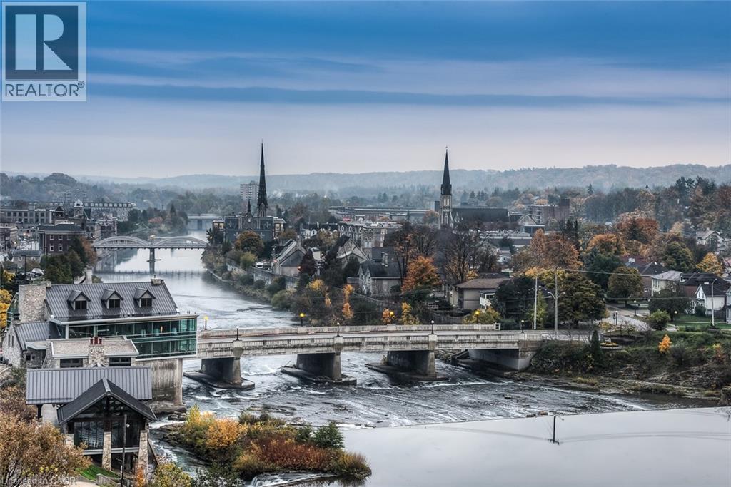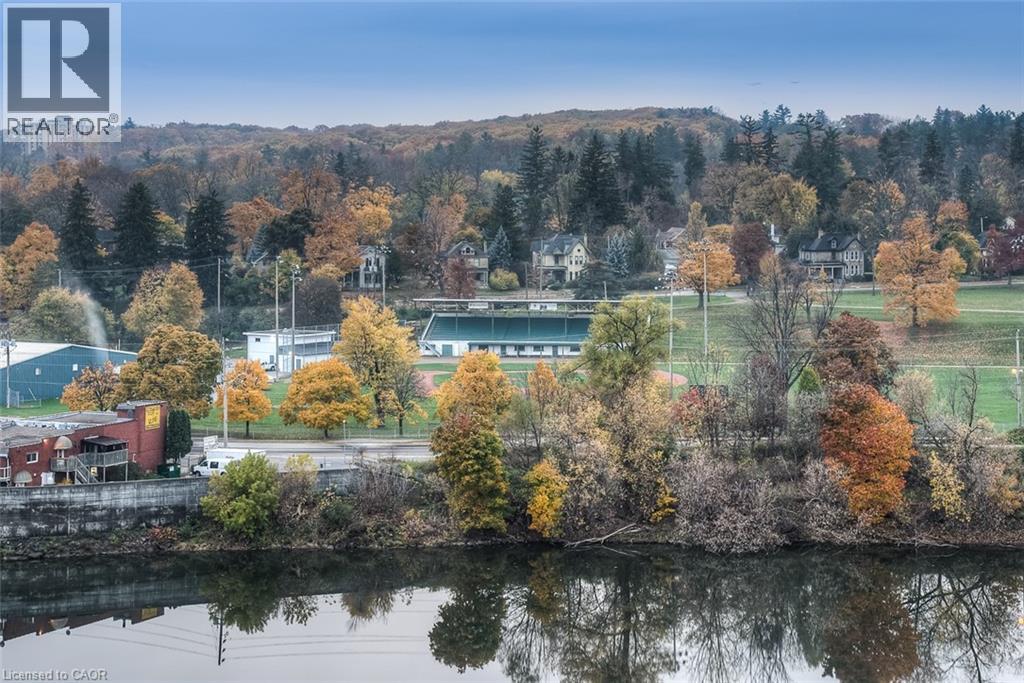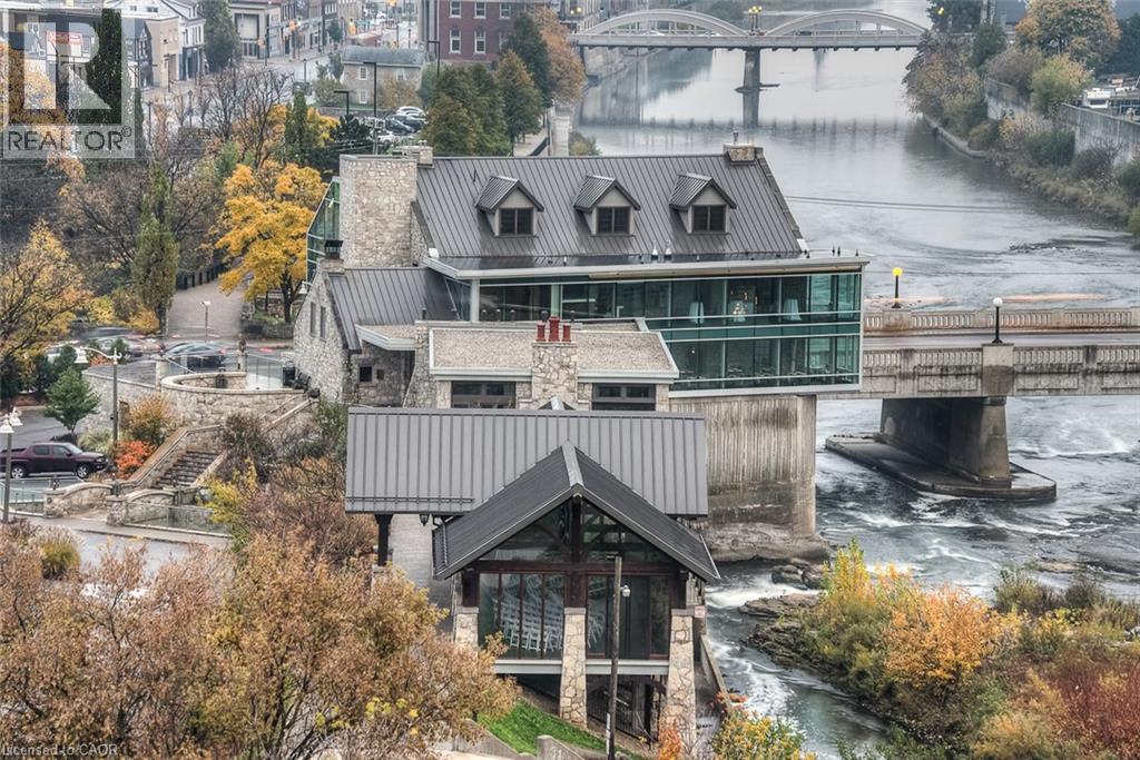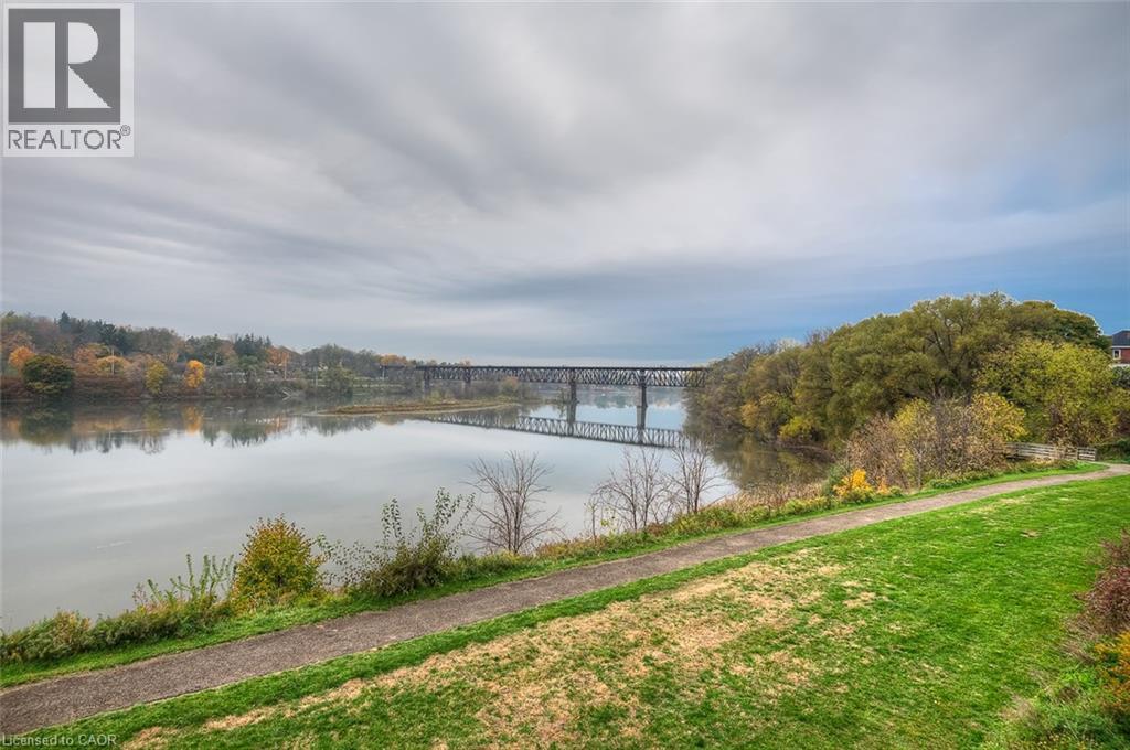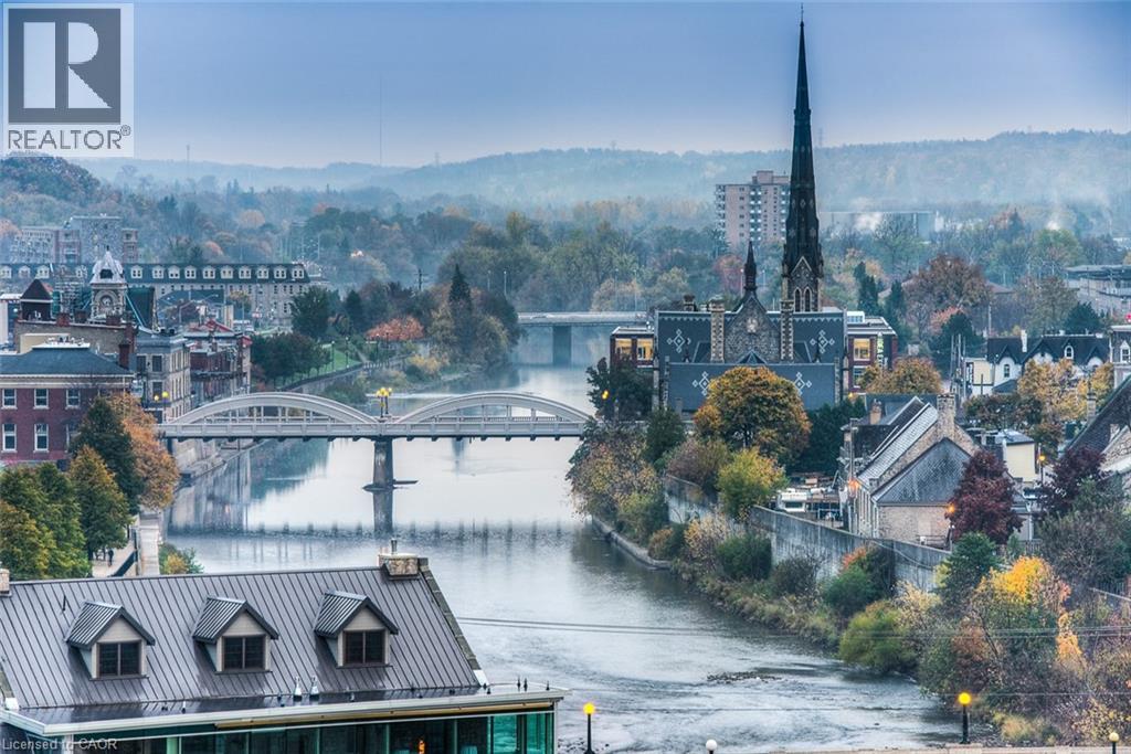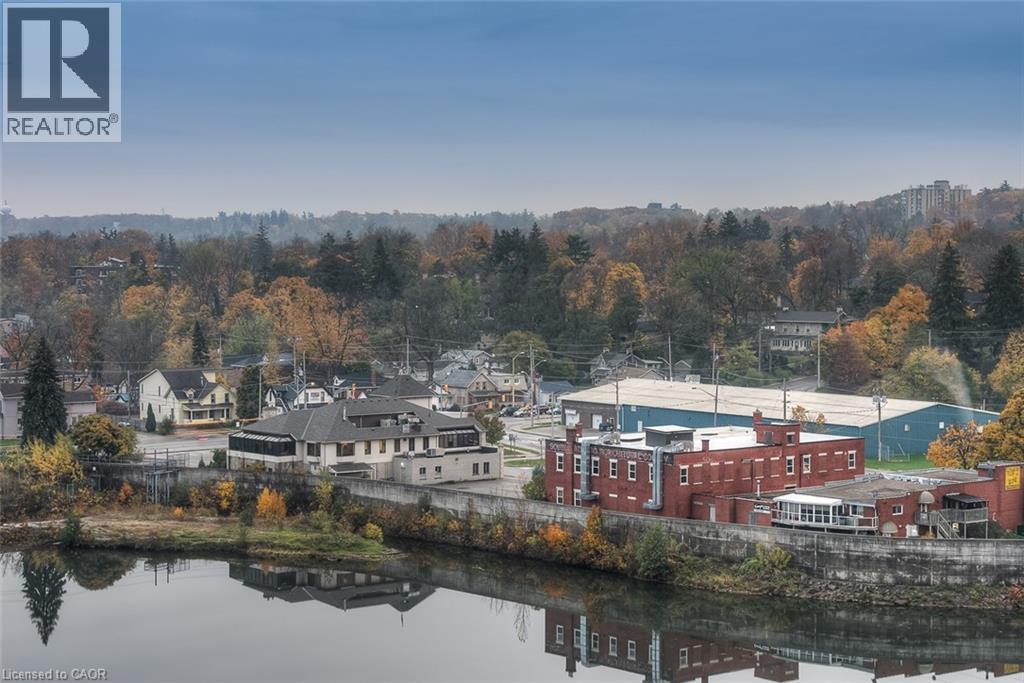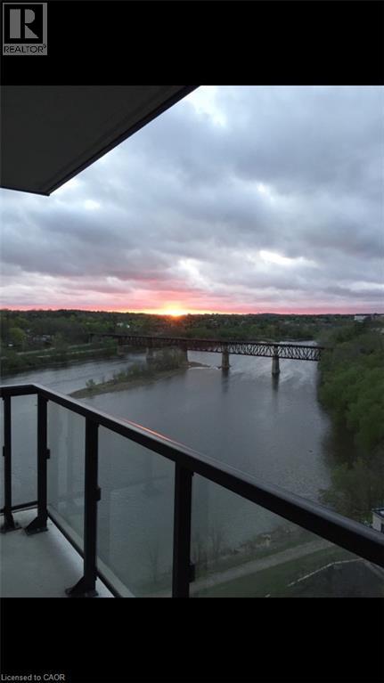 This Stunning 1 bed 1 bath corner end unit offers stunning picturesque views of the Grand River from the 105sq.ft balcony. Additional large airy windows also give you views of the gardens and street, this unit is really a must see to appreciate it. This unit offers laminate flooring, granite countertops, SS appliances and separate storage/laundry room that contains a stackable washer and dryer leaving plenty of room for your storage needs. 2 seperate owned parking spots come with this unit, 1 underground and 1 at the front of the building. A Storage locker, gym and party room round out the added features included. You will be steps away from Shopping, restaurants, trails and the Hamilton Family Theater. (id:20029)