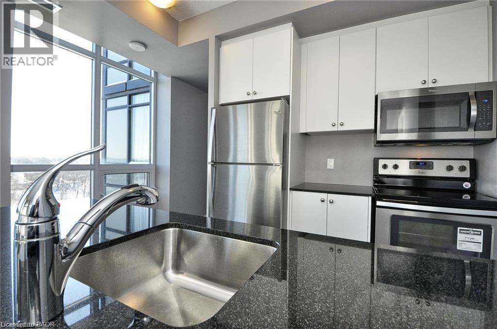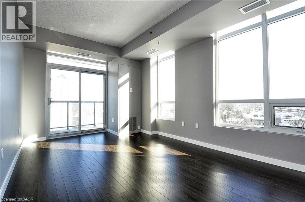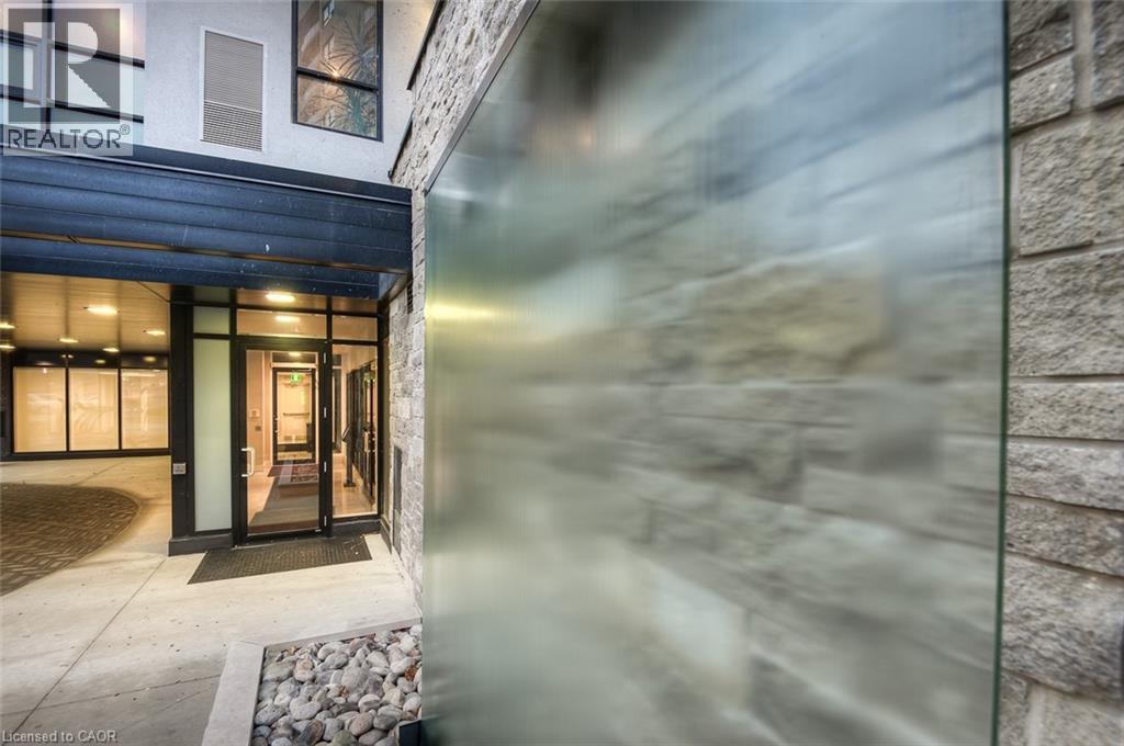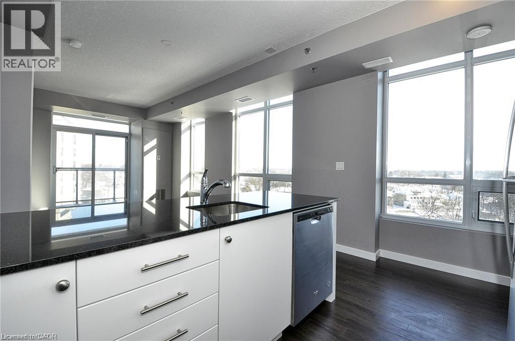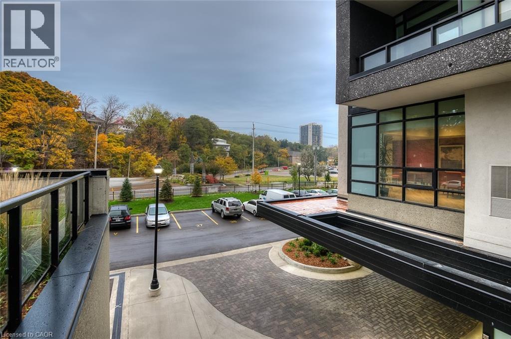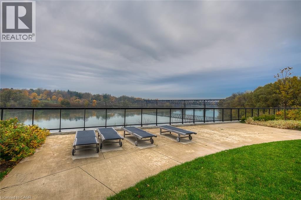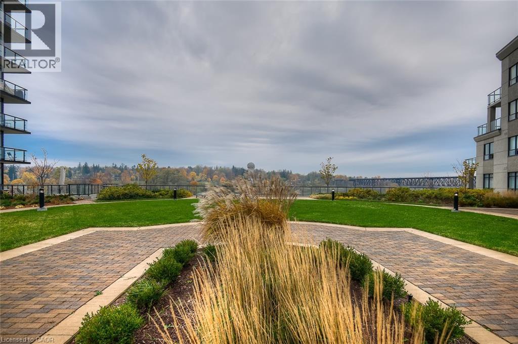 This Stunning 1 bed 1 bath corner end unit offers stunning picturesque views of the Grand River from the 105sq.ft balcony. Additional large airy windows also give you views of the gardens and street, this unit is really a must see to appreciate it. This unit offers laminate flooring, granite countertops, SS appliances and separate storage/laundry room that contains a stackable washer and dryer leaving plenty of room for your storage needs. 2 seperate owned parking spots come with this unit, 1 underground and 1 at the front of the building. A Storage locker, gym and party room round out the added features included. You will be steps away from Shopping, restaurants, trails and the Hamilton Family Theater. (id:20029)
